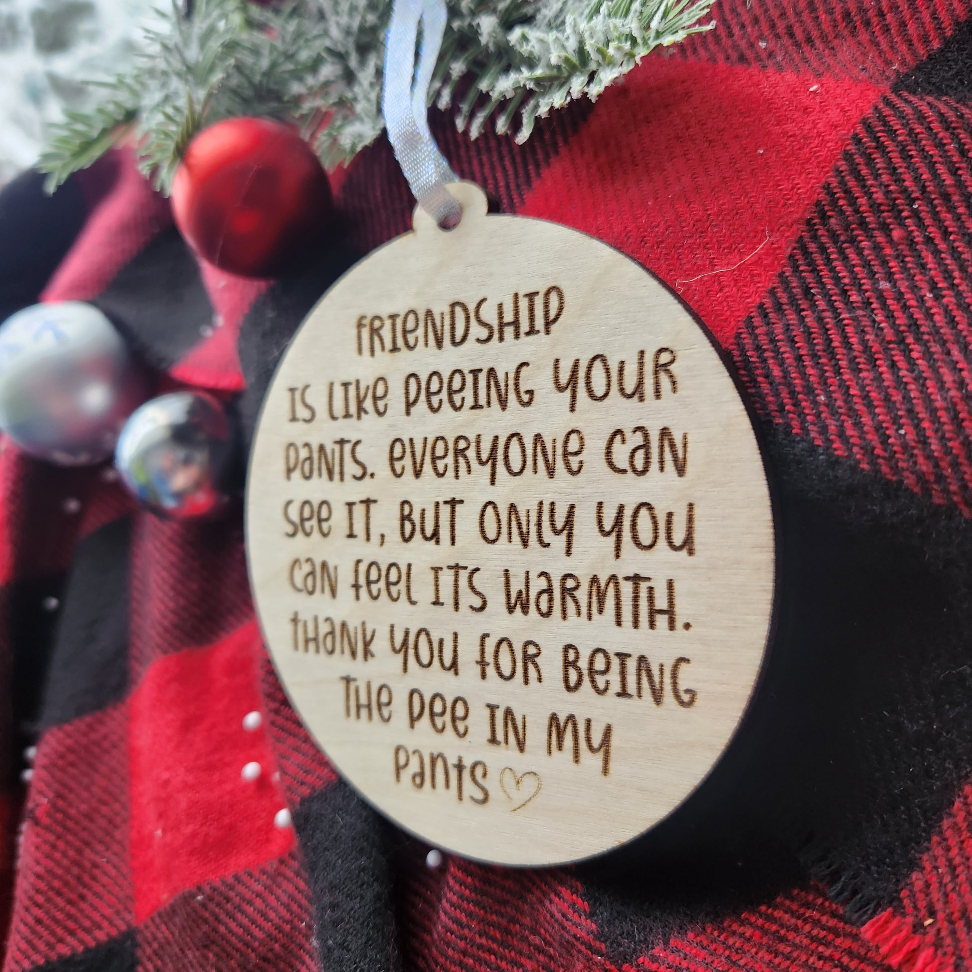 Celebrate the hilarity and warmth of true friendship with our "Friendship Is Like Peeing Your Pants" ornament. This playful and witty ornament reminds us that friendship may not always be visible to others, but its impact is deeply felt. Hang it proudly and embrace the joy and comfort that only true friends can provide. Perfect for gifting or displaying, it's a whimsical reminder of the unbreakable bonds that make friendships so special.