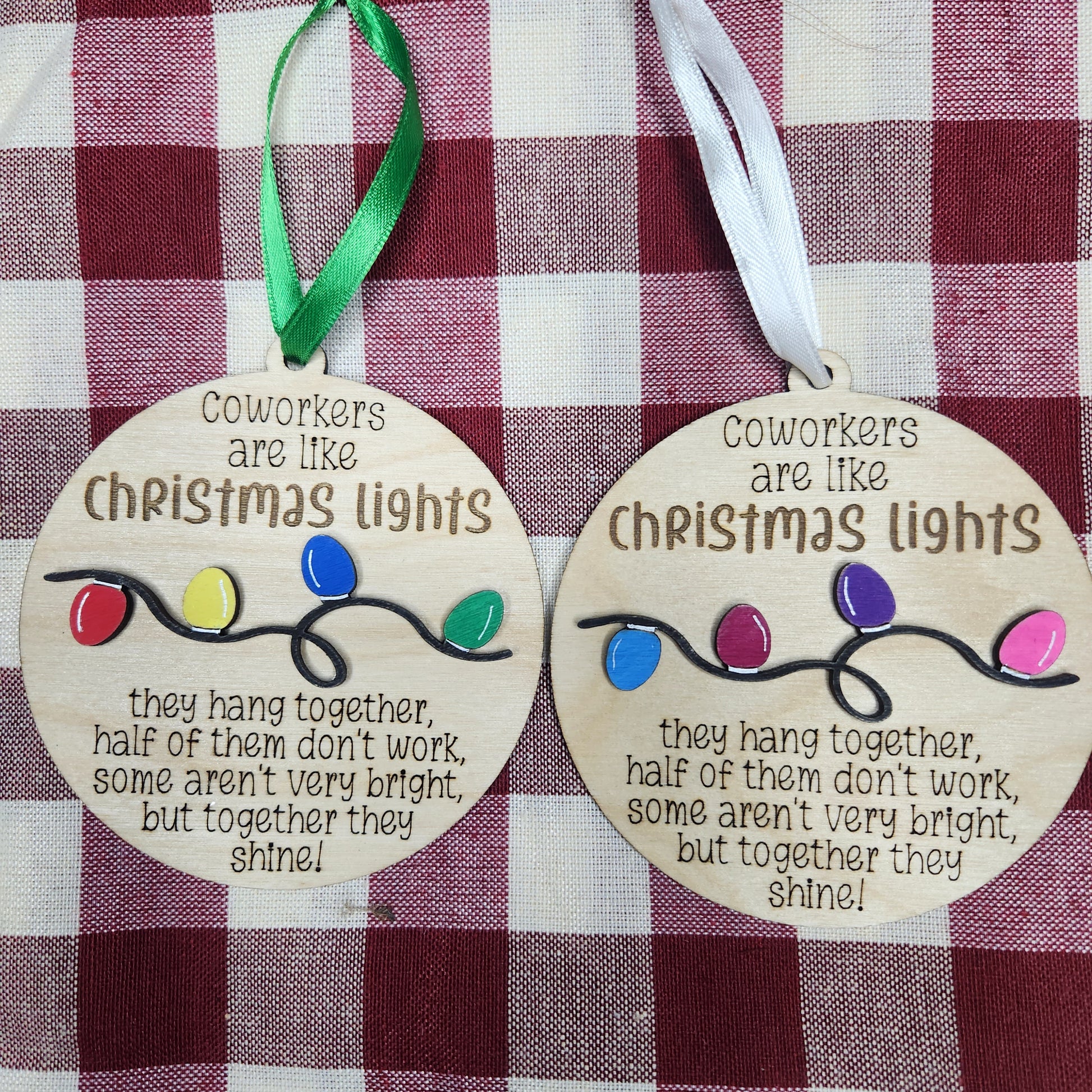 This "Coworkers are like Christmas Lights" wood ornament is a witty and relatable addition to your holiday decor. Made from high-quality wood, this ornament features a charming design with the phrase "Coworkers are like Christmas lights - they hang together, half of them don't work, some aren't very bright but together they shine" beautifully engraved on it. With its clever analogy, this ornament captures the ups and downs of working with colleagues in a lighthearted and humorous way. Hang it on your Christmas tree or gift it to a coworker as a fun reminder of the camaraderie and teamwork that makes the workplace shine. This ornament is sure to bring a smile to anyone's face during the holiday season.