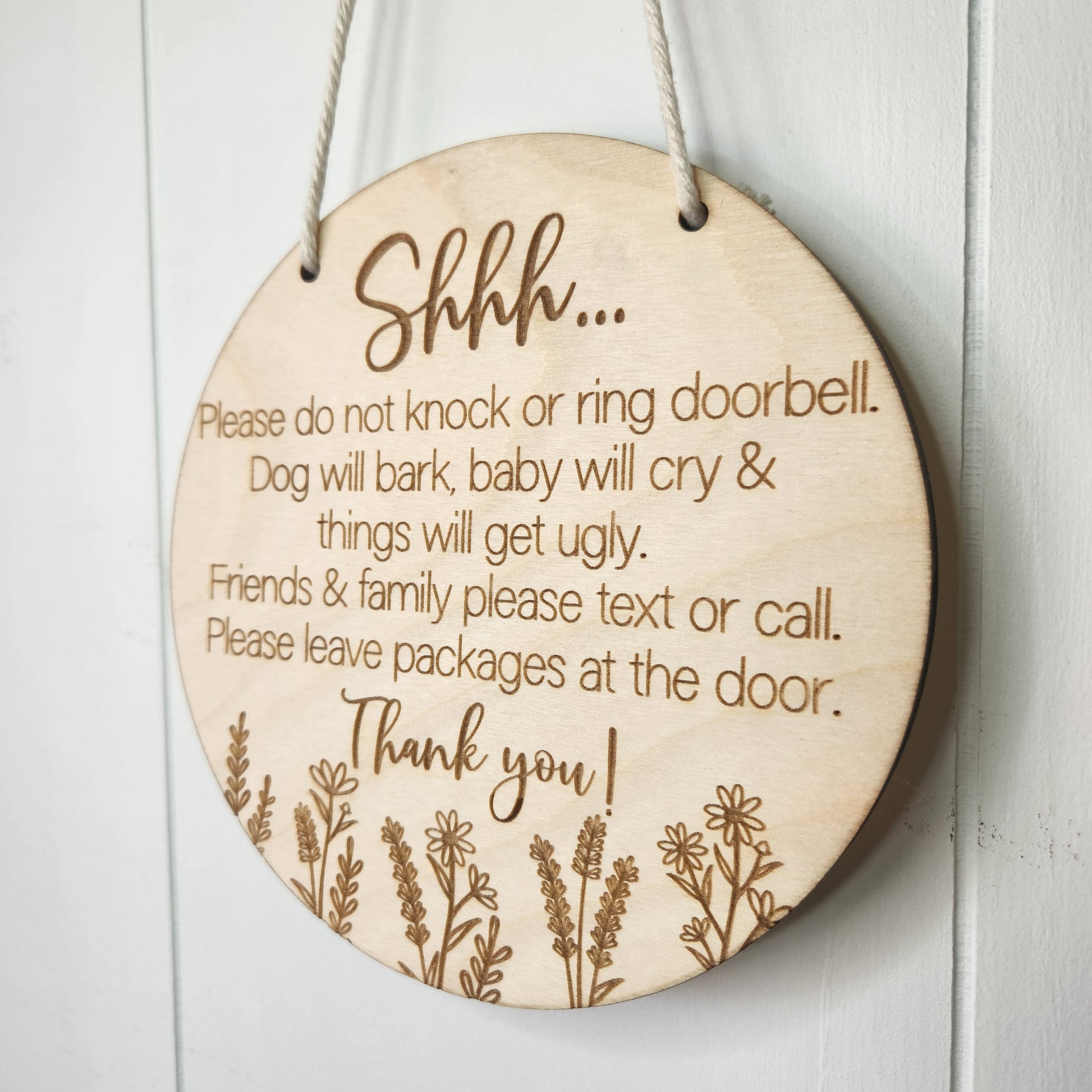 This hanging door sign is a polite way to prevent visitors from waking your sleeping baby. This sign is 6” and made of ¼” Baltic birch plywood with a macrame hanging rope. The sign is laser engraved and also comes with a felt pad on the back. It can be hung on the door knob or on a wreath hanger/hook depending on your preference (not included).